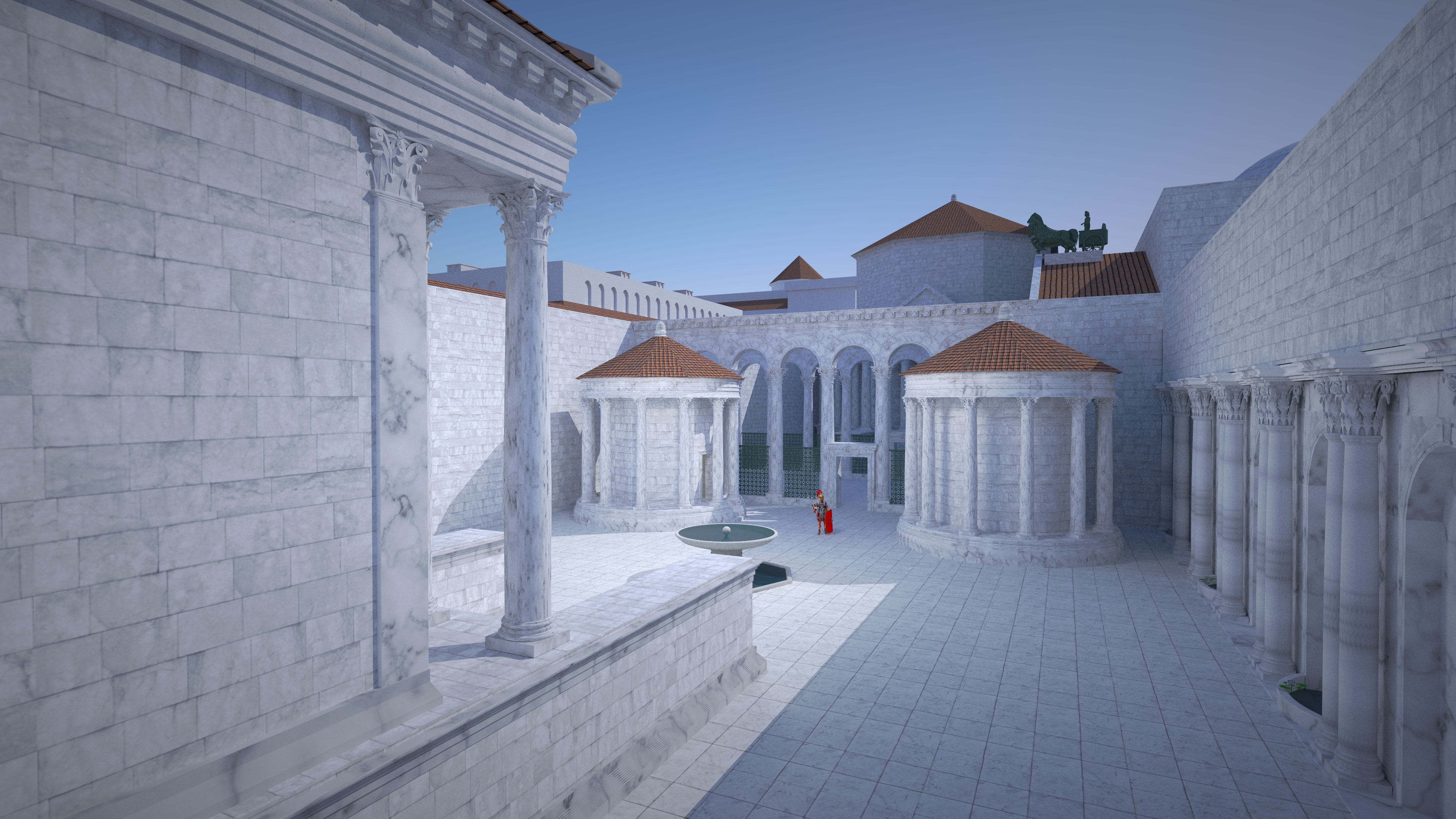 chrámami v pozadí vidieť stĺporadie peristylu, nad