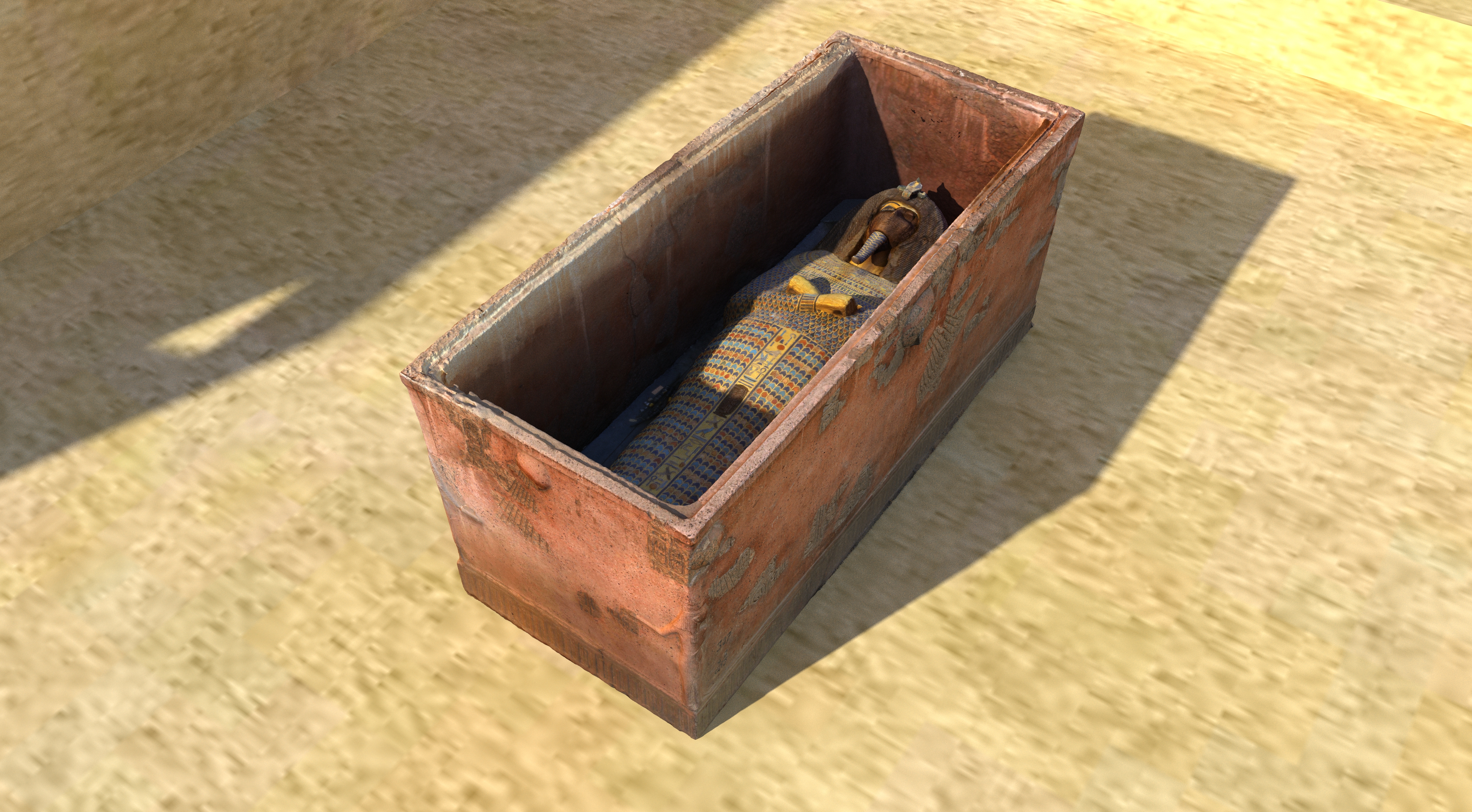 Achnatonov sarkofág a rakvu v pohrebnej komore E. Sarkofág bol nájdený na mieste ale rozbitý na malé kusy, z ktorých mnohé chýbali. Neskôr bol zreštaurovaný s doplnením hmoty do predpokladaného pôvodného stavu. Veko drevenej rakvy Achnatona s bohatou výzdobou zo zlata a polodrahokamov bolo nájdené v Údolí kráľov v hrobke KV55 spolu s telesnými pozostatkami Achnatona, kráľovnej Teje (Tiy) a tzv. Mladšej dámy - matky Tutanchamona. Do KV55 boli zrejme prepravené v čase ničenia Amarny z bezpečnostných dôvodov. Sarkofág a rakva sú vystavené v Egyptskom múzeu v Káhire. |